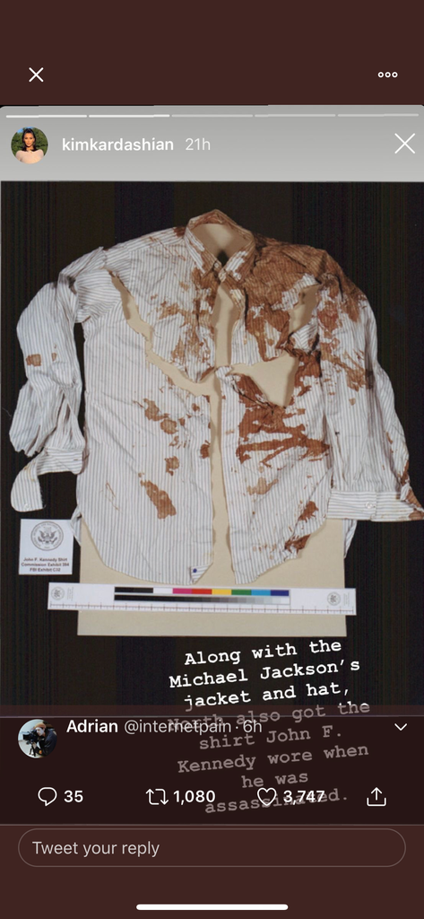 Over the weekend, Kim Kardashian West shared a few of the Christmas gifts she and Kanye West put under the tree for their oldest child, North West. Among them, rather unconventionally, were some of Micheal Jackson’s personal items — including a jacket and a white hat. Kardashian West posted photos of the presents on her Instagram story, captioning the hat picture: “Along with jacket, North also got Michael’s “Smooth Criminal” hat. It still has his makeup on it.” Perhaps even more surprising, though, was that she also gave North the shirt President John F. Kennedy was wearing when he was shot and killed.