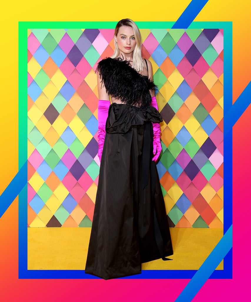 Featuring a billowing skirt with an exposed bra and a feathery sash — an ostrich plume — on top, the outfit was completed with a pair of long, fuschia gloves. The opera gloves reminded us of Zoë Kravitz’s recent Golden Globes look, which has us wondering if dainty evening gloves are officially making a comeback (excuse me while I raid my 90-year-old grandmother’s stash for NYFW). Styled by Kate Young, Margot’s look was just the right amount of over-the-top, and perfectly bird-like for the big event. Keeping her hair simple and straight and adding a dash of pink hue on her cheeks and lips, another detail we loved was her glittery lime green eye shadow, which matched a sash she donned in one of Young’s photos on Instagram.