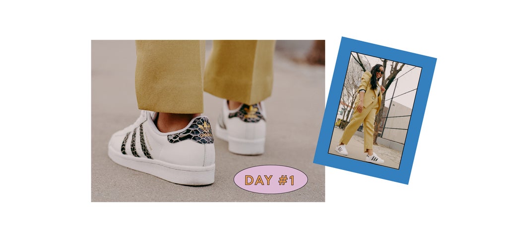 A few months ago, after being tasked with a multi-day styling challenge in which she put together five looks around the same sneaker, Refinery29 beauty writer Aimee Simeon might’ve found The One: the classic adidas Originals Superstar, given a makeover with slick animal print and gold accents as part of the brand’s new Red Carpet Shine collection. “They’re equal amounts cute and comfortable,” she says. “I usually wear the all-white Superstars, but these were really fun because they were classic with a pop of what felt more modern and trendy. They inspired me to have a little bit more fun with the outfits compared to wearing a one-tone shoe.”