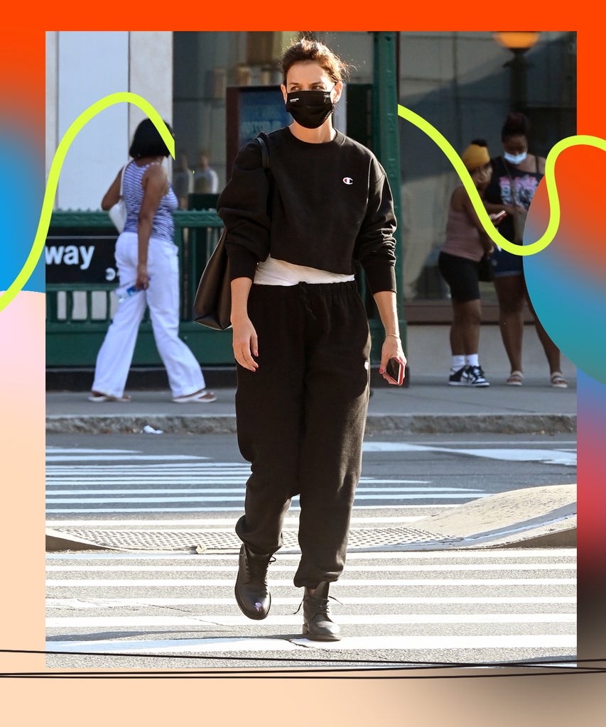Like us, Katie Holmes wants to dress like J.Lo. This week, the Dawson’s Creek alum was spotted strolling through downtown Manhattan, wearing a black Champion sweatsuit, likely pulled from her lockdown wardrobe. (Old habits die hard.) Specifically, she wore a cropped crewneck sweatshirt from the sportswear brand, with a white tank top, matching black Champion sweatpants, combat boots, and her go-to leather tote bag from Sharkchaser. But while we love to see Holmes, who frequents Khaite, Gucci, and Ulla Johnson, dressing in more attainable fashions — her cropped crewneck is currently on sale on Amazon for $44 — that isn’t the only reason we’re so head-over-heels for her casual look.