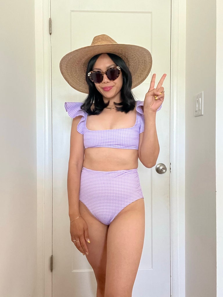 Since there are no cups or lining, it was a bit see-through in the chest area under certain lights. In addition, it gave off more of an athletic feel than the flirty aesthetic that I thought it would have, but that’s a personal preference. Nonetheless, it’s a beautifully soft and stylish one-piece to have in your wardrobe. I could imagine myself wearing cutoff shorts or a loose button-up over it when I’m out of the water and grabbing a drink or snacks. The pastel hues match perfectly against the waves for a relaxing, laid-back summer day look.” — Vivien Lee, Affiliate Fashion Writer