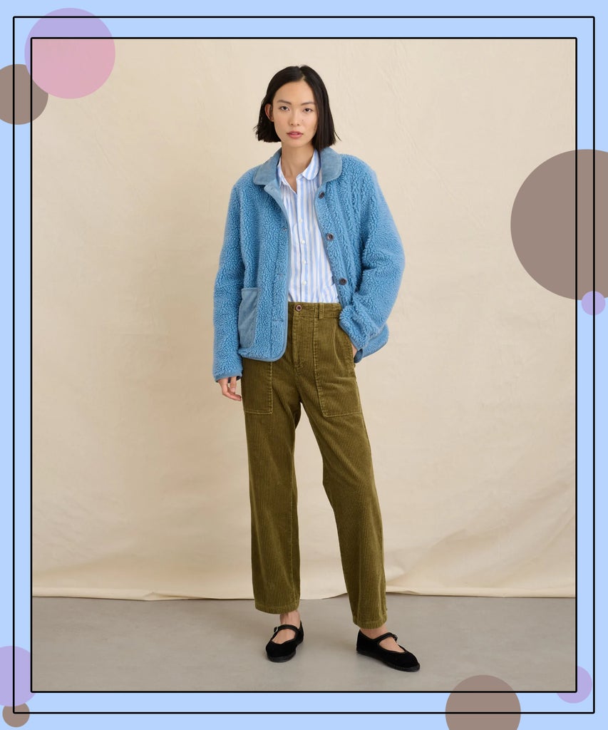 Similar to the all-cotton Britt version that came before it, the Sherpa boasts a rectangular silhouette with front patch pockets and a dignified collar that Bill Cunningham may have approved of. The outside shell is wrapped in fluffy sherpa (made from 100% recycled polyester), and the inside is lined in fleece. Closer-look design details include a button-down closure and corduroy panels and trim, offering a handsome contrasting texture to all the faux shearling. In essence, the Sherpa Work Jacket has all the elements you’d expect from a classic French workwear jacket, but in a cozier, warmer fabrication for these fall-into-winter weeks. The Natural and Powder Blue colorways have returned along with a brand-new option of Military Olive.