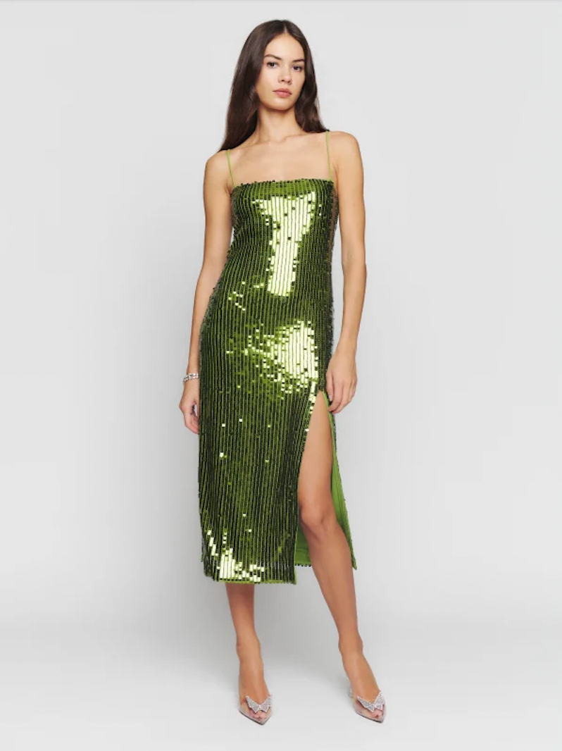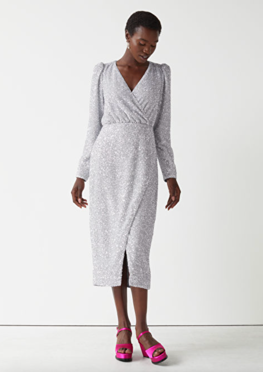 A midi style is an appropriate in-between option for a festive party with family or coworkers. It's elevated without feeling too formal — an still has lots of sparkle.