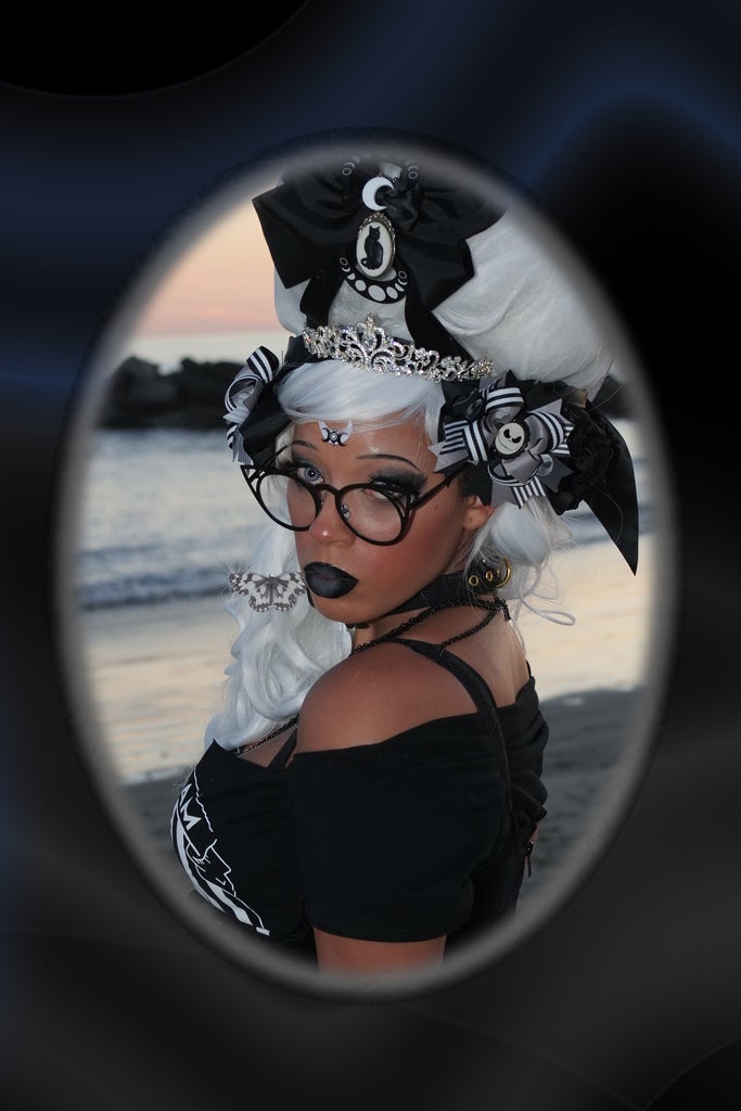 Lately, I’ve been really vibing with big white wigs. I like that it contrasts with my mostly black outfits. I like to either tease my wig or dress it up in a really big beehive hairdo inspired by Winehouse. After I finish styling, I add lots of bows, flowers, clips, and headbands. I think of my wig as my huge crown and then I adorn it as such. It gives goth royalty. When I’m not wearing big bold styled wigs, sometimes I wear a simple lace front and add a graphic snapback, depending on the kind of look I’m going for.