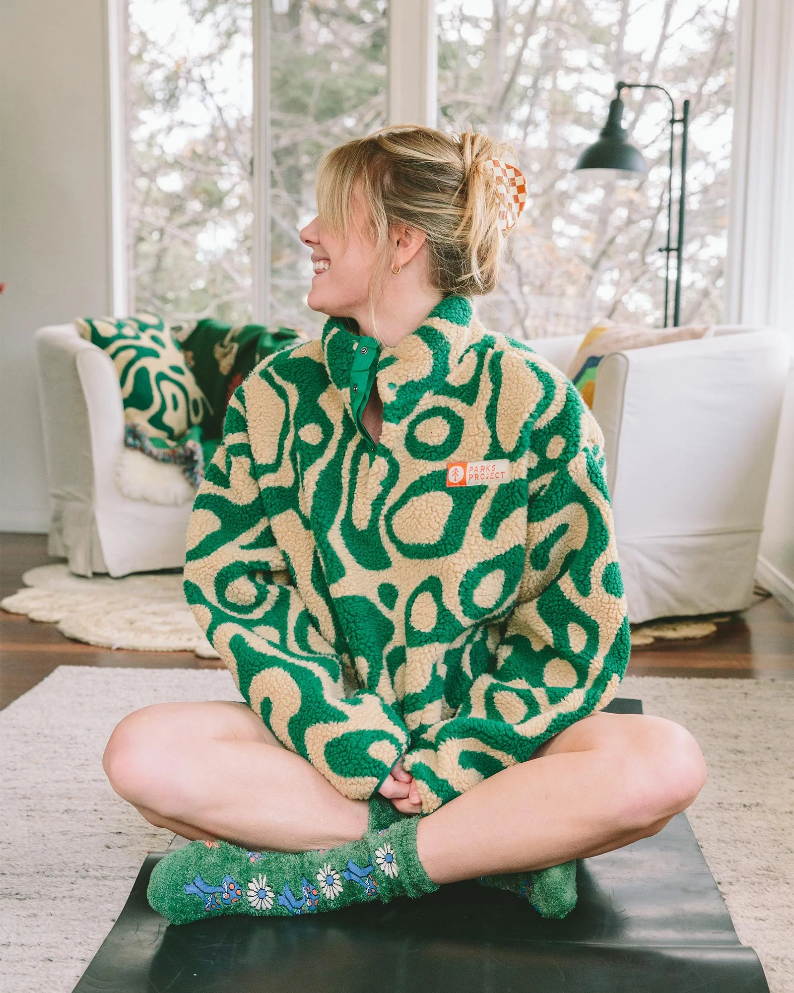 Add a little bit of pizzazz to your outerwear by option for a sherpa jacket with a whimsical abstract print or floral motif. A perfect example is this groovy green Parks Project sherpa jacket showing a geyser trail.