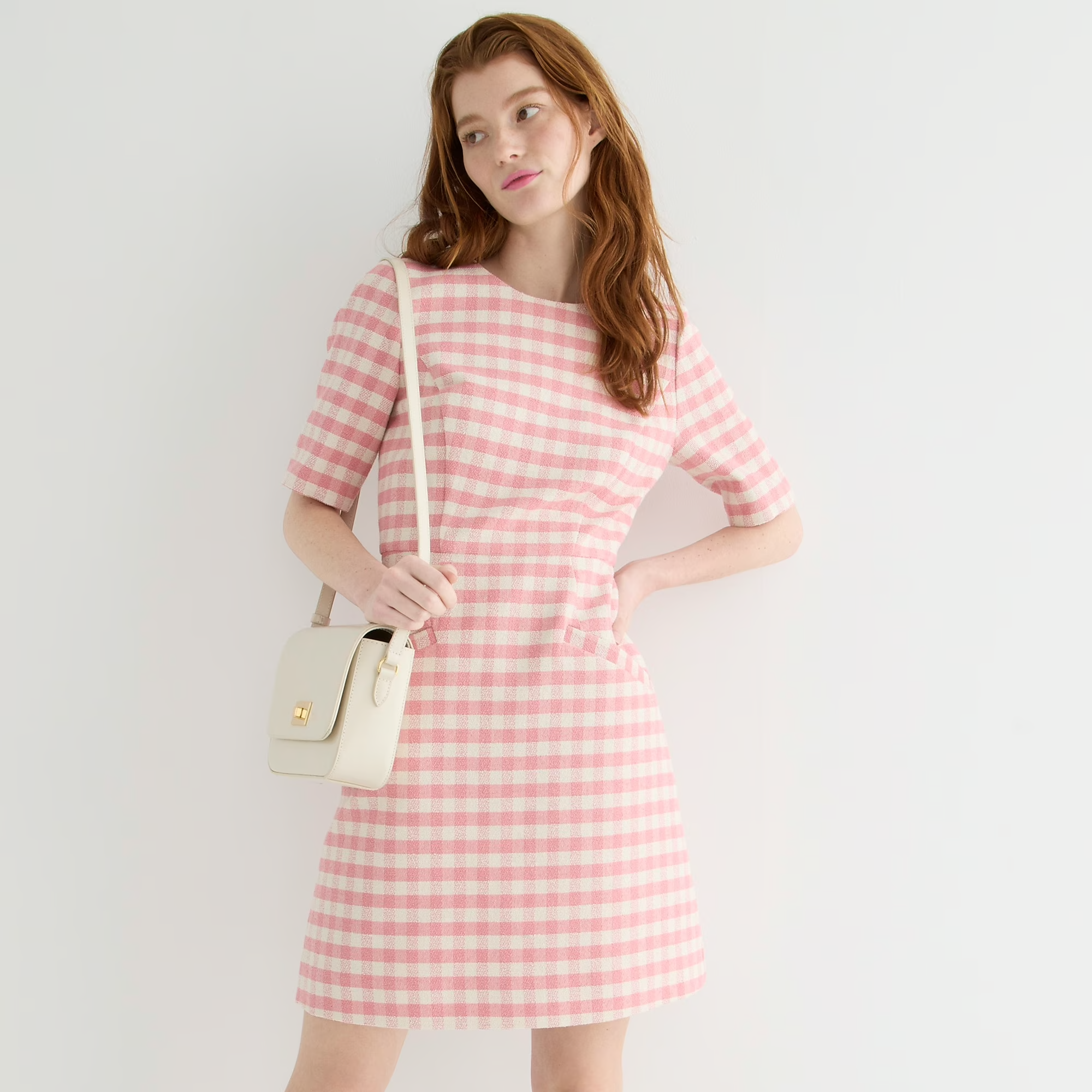 J.Crew Short-sleeve mini dress in gingham terry tweed, $, available at J.Crew