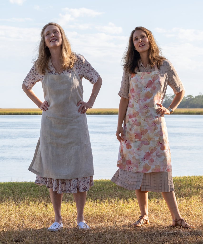 As Elizabeth stops passively observing and attempts to relive the events of the past using some morally objectionable tactics, the two women start blending into each other, which is driven home through Napier’s wardrobe selections. Inspired by the 1964 film The Pumpkin Eater, where a man is caught in a triangle between his wife and young mistress, Napier wanted Gracie and Elizabeth to reflect each other in button-front dresses and aprons (top photo) for a baking scene. “They’re tonally the same, but Natalie has the graphic [print], and Julie has the floral. And then we put the floral apron over Natalie — imagining that the apron that Julie would have hanging in her house would be a floral one — to mimic the floral dress Julie’s wearing,” says Napier. “Mirrors are such a major part of this film, in terms of identity, your reflection of yourself, you looking at yourself.”