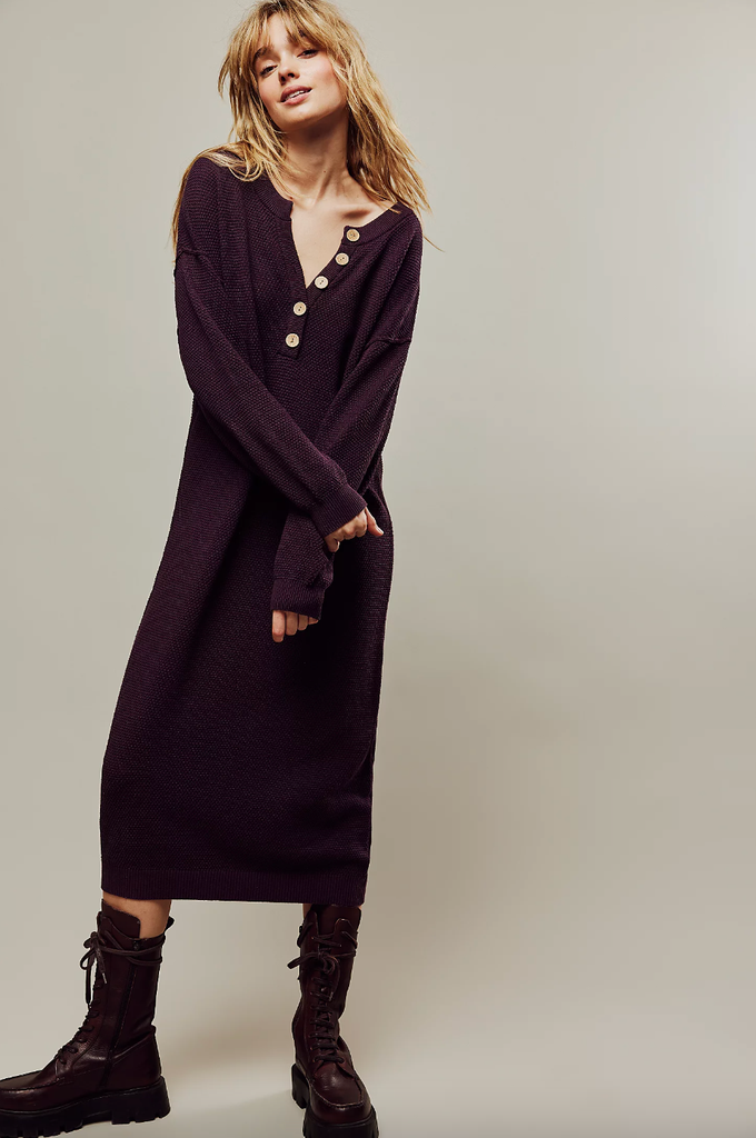 This deep wine knit midi dress is laidback, cozy, and perfect for those I-can’t-be-bothered days. Style it with your favorite chunky lug sole boots and winter coat or faux fur jacket. The slightly oversized sleeves, scoop neckline, and button-front detail add comfy, homey vibes to the one-piece, making it a wardrobe staple you’ll never want to take off.