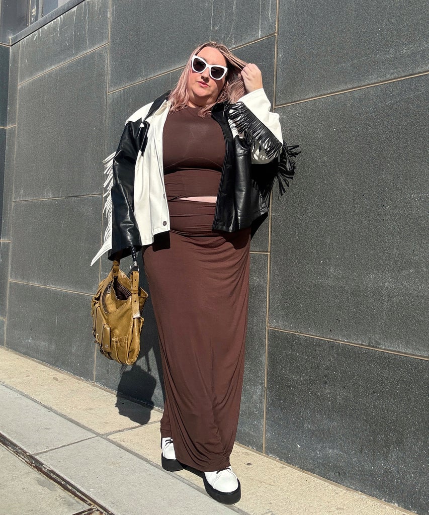 For NYFW, I paired it with a slinky jersey set from from plus-owned label Gia IRL. The lived experience of model founder Gia Sinatra is evident in the impeccable fit of this seamed flowy maxi skirt. Whereas most jersey skirts in this style tend to cling to bellies and flare weirdly below thick thighs, this one just skims and flows beautifully. I also love that it is available in sizes up to 30. I finished the look with white croc-embossed combat boots, white cat-eye shades, and a Tom Ford-era YSL bag to pull out the neutral tones of the skirt set.