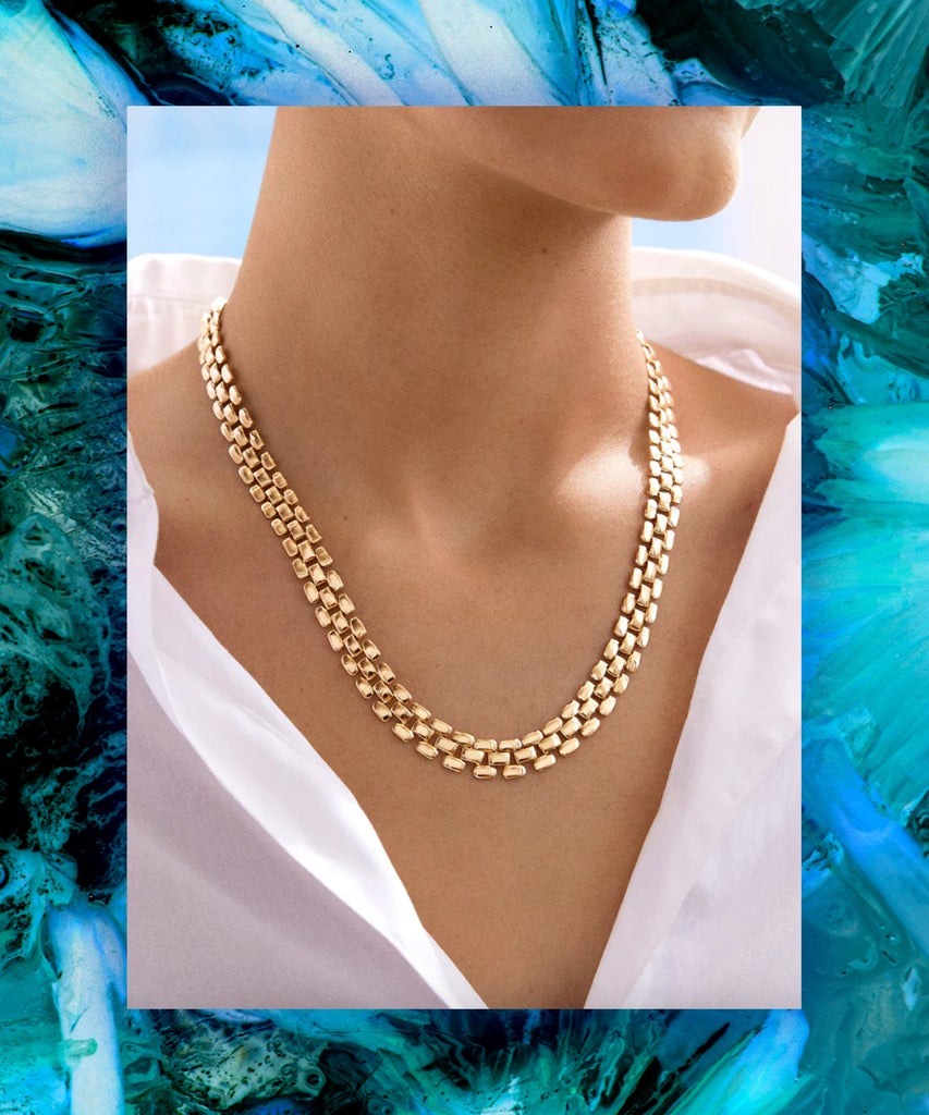 When we think of chunky necklaces, chain styles are the ones that come to mind. But they don’t just need to be gold or silver; multicolored ocean-themed necklaces have been spotted on catwalks along with mixed materials, such as pearls and gold. Youthful styles like puffy initial necklaces and charm necklaces are also having a moment.