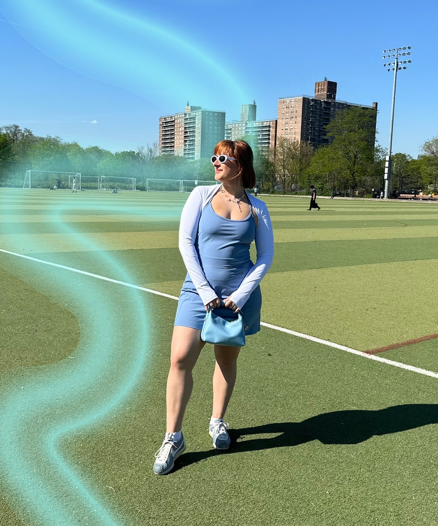 I decided to dress up my Vuori tennis dress for a trendy “elevated athleisure” look. I paired it with bright-white sports sleeves because, hey, a shrug can elevate anything. I also opted for my on-trend gingham Nike Cortez sneakers rather than basic white tennis shoes, but I could’ve easily worn strappy sandals with this dress too. I had the most fun with my jewelry, though, putting on pearl drop earrings, an asymmetrical beaded necklace, and a shimmery belly chain. Then I pulled the outfit all together with crystal-adorned white sunglasses and a buttery blue top-handle bag. In the end I felt chic, and certainly not cheesy.