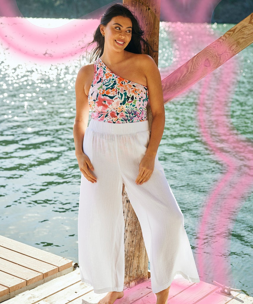 The collab lineup includes staple silhouettes and fabrics from both brands in four trendy colorways: Sea Urchin & White Sand (a classic black and white), Calypso & Deep Sea (an on-theme blue), Strawberry (a summery pink), and Sea Foam & Harbor (a bold teal). In terms of styles, Summersalt has reimagined some of its bestselling styles, such as the Perfect Wrap One-Piece and the one-shoulder Sidestroke swimsuit. Meanwhile, L.L.Bean has offered its soft and airy 100-percent cotton Cloud Gauze material for the cover-up pieces, which range from a mini skirt to wide-leg pants, a cropped button-up T-shirt, and a button-front midi dress. The collection also includes the Perfect Wrap Tankini Top, a brand-new swimwear silhouette.