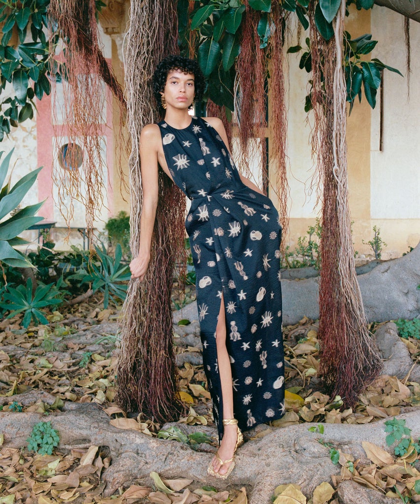 Designed with vacation dressing in mind, the joyful, print-forward collection is inspired by Italian palazzos, Venetian glass, and shell-encrusted grottos, which translates into effortlessly glam pieces. Standout styles include breezy ruffle-trimmed kaftans, printed silk shirt-and-short sets, slinky maxi dresses, metallic swimwear, crocheted layers, and textured gold sandals. The capsule also features statement jewelry made with recycled brass.