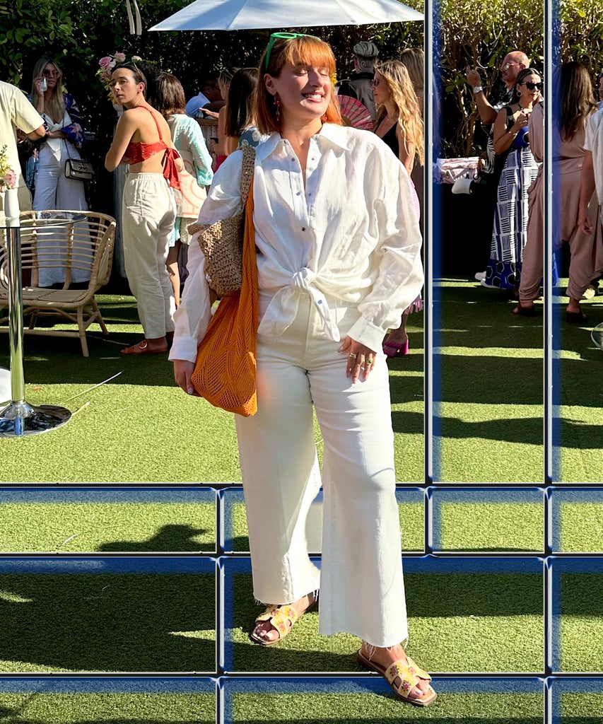 If Memorial Day gave you the immediate urge to wear all-white, we felt the same. I paired Paige’s Utility High-Rise Wide-Leg Jeans with a white oversized linen button-down shirt, which I tied in the front. To break up the monochromatic look (and make it more interesting), I added colorful accessories. Try styling your white denim outfit with vibrant sunglasses, statement jewelry, crochet bags, and patterned sandals.