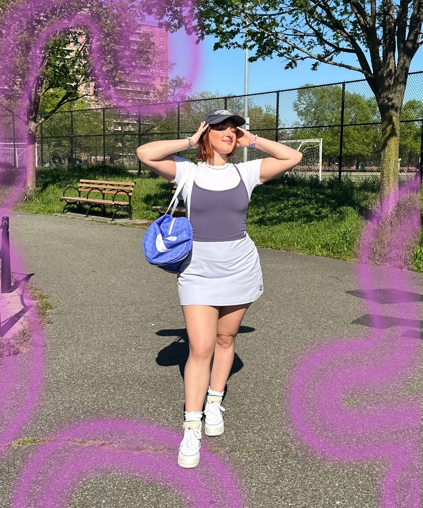 I decided to dress up my Vuori tennis dress for a trendy “elevated athleisure” look. I paired it with bright-white sports sleeves because, hey, a shrug can elevate anything. I also opted for my on-trend gingham Nike Cortez sneakers rather than basic white tennis shoes, but I could’ve easily worn strappy sandals with this dress too. I had the most fun with my jewelry, though, putting on pearl drop earrings, an asymmetrical beaded necklace, and a shimmery belly chain. Then I pulled the outfit all together with crystal-adorned white sunglasses and a buttery blue top-handle bag. In the end I felt chic, and certainly not cheesy.