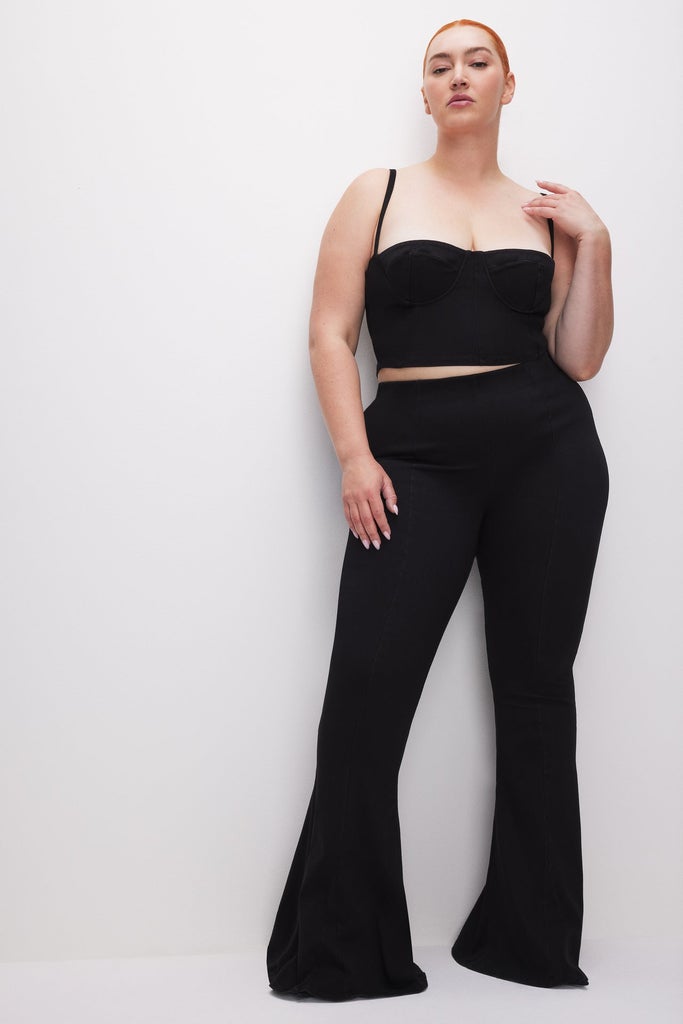Denim experts at brands like Frame and Good American are already offering an alternative to the ubiquitous wide-leg silhouette for those who want to step away from skinny jeans in an even more dramatic fashion. Enter: the extreme flare, featuring a tight fit until about mid-way down the calf at which point the fabric splays far out from the ankle to create an eye-catching, opposite-of-skinny shape.