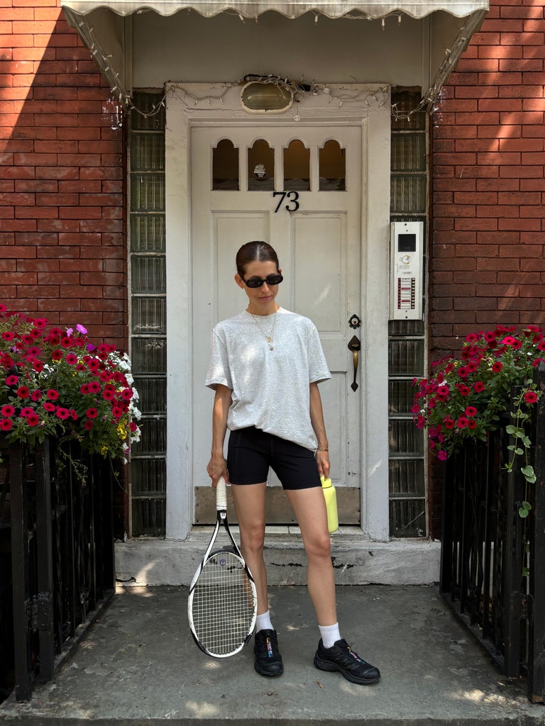 “My silhouette preference has always been oversized, so I knew I’d like the boxy loose fit of this boyfriend tee. I find I wear this T-shirt most when dressing for any physical activity or casual outing because it’s breathable and unrestricting. I also find that it works best on my petite frame with more fitted bottoms. Here I’ve styled it for an afternoon of tennis with bike shorts and sneakers, but I just as often swap the performance sneakers for a more casual pair for a coffee run. Personally, I’ve found the boyfriend T-shirt to be really versatile. I wear it with activewear, denim, and even sleep in it. The fabric is also buttery-soft — almost cloud-like — but unlike most fabrics of this nature, I’ve found it doesn’t pill at all after many wears and several washes. Although I’m wearing the heather grey colorway in this photo, I’ve had the marble color for several years and can definitely vouch for its durability.” — Kate Spencer, Sr. Affiliate Partnerships Manager