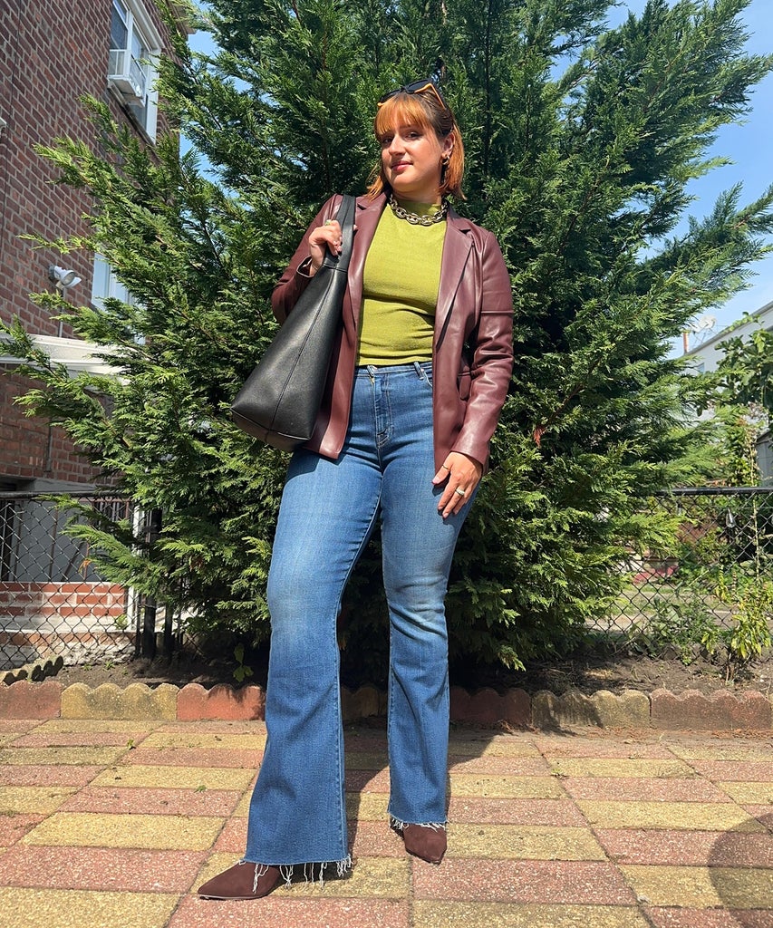 These comfortable and flattering frayed jeans may be my favorite Mother style of the bunch, so I was really excited to style them. From a red-brown blazer and leather work bag to a Brat green high-neck top and suede pointed booties, I picked vintage-inspired fabrics, color palettes, and styles that complimented the denim and felt modern when combined all together. If you also plan on wearing denim to the office this fall, make sure to pair your dark-wash flare jeans with high-quality investment pieces that will elevate your look and have you feeling chic and confident.