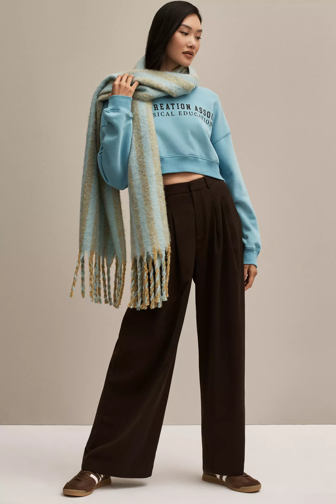 Bold and bright, colorblock scarves bring a playful edge to any look. With unexpected combos like mustard with lilac or navy with coral, they add a fun pop to neutral winter layers and enhance maximalist palettes without going over the top. Toss one on for an instant dopamine rush during winter’s grayest months.