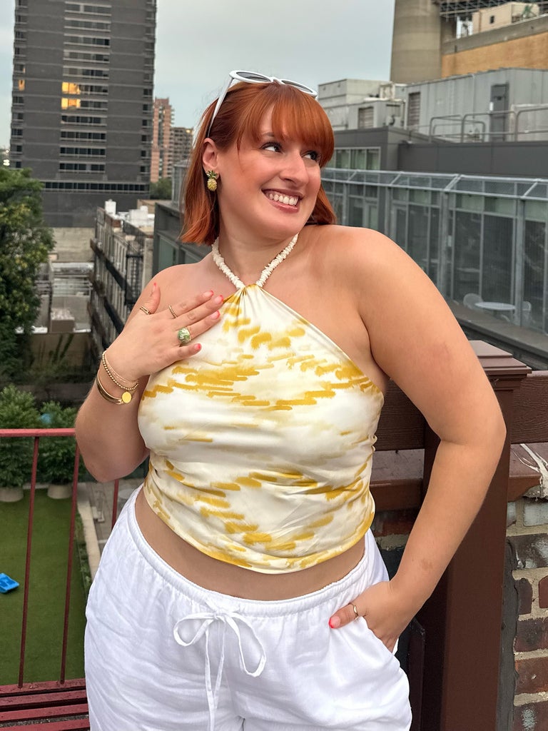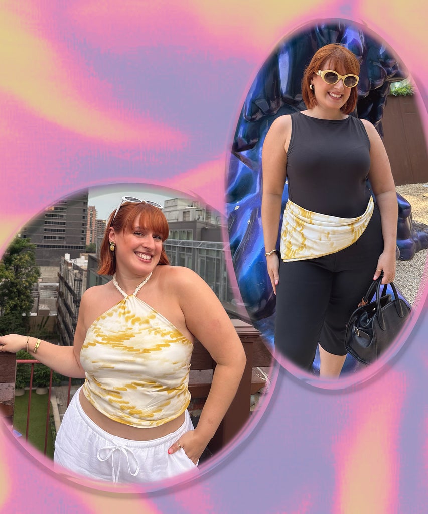 After seeing tons of videos of creators DIY-ing their square scarves into halter tops, I (again, skeptically) tested the look. The most popular option is to tie the scarf through a choker necklace. Despite my fear that this would pull on my puka shell necklace and shatter it (again resulting in a flashing situation), this is my new favorite hack! After folding the scarf into a triangle, I tied the points around my necklace, tucking the extra fabric underneath, then taking the other points to tie behind my back. It stayed in tact throughout a night out, plus I kept getting compliments on my “top,” before I shared the big secret. If you want an alternative halter option, you can also slip two points through a chunky ring, which will sit at the front bottom of your neck, before tying the points behind your neck.