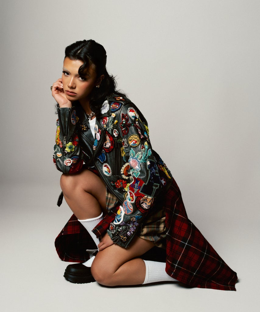 It’s the details that differentiate Zerina’s modern take on grunge. “From your belt buckle to the grommets on your boots, the patches on your jacket – that’s really what it’s about,” Akers says of the trend. Small styling choices deliver the nuance: plaid skirts, a flannel tied at the waist, and a patchwork moto jacket on top push the mix forward while maintaining its grit. The rawness is there, but sharpened just enough to feel deliberately reconsidered.