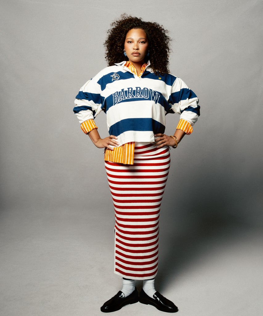 Akers pushes your classic stripe way beyond basic: this fall, they’re stacked and layered for impact. Whether you’re mixing a rugby with a solid piece, or playing with two different stripes, the approach is straightforward but lands with a punch. For this look, she paired a Barrow rugby sweatshirt over a Marimekko button-down, added socks that echo the pattern, and finished with glossy Zara loafers. The magic is in the mashup — wide bands versus skinny stripes, color colliding with neutrals, sportswear mixed with tailoring.