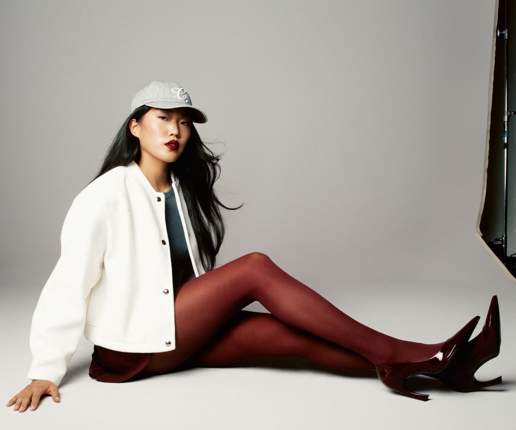 What cherry red was to summer, scarlet is to fall. This season, Akers is threading the pop of color through multiple items — tights, gloves, boots — to cut through an otherwise neutral look. Here, she pairs burgundy tights and patent pumps alongside a tonal skirt and handbag, finished with a white bomber for instant freshness. It’s bold without being complicated, the kind of styling move that makes classic pieces feel instantly new.