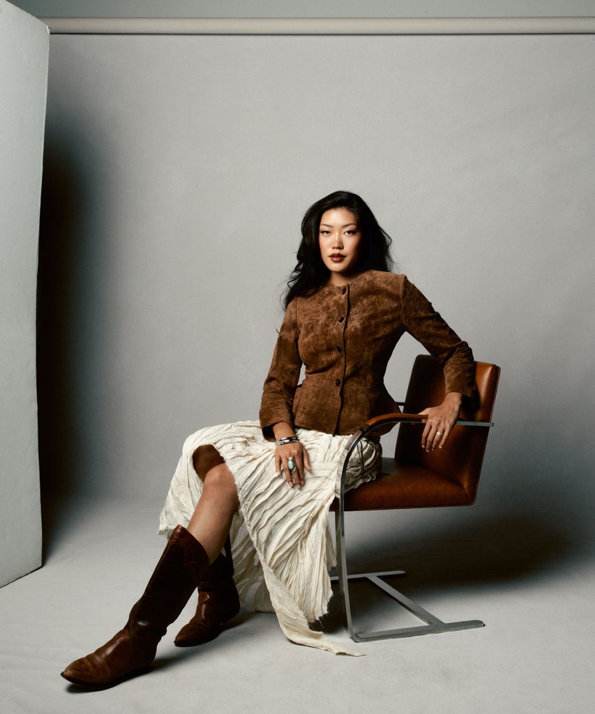 This isn’t the sheer, body-baring look you might expect. Akers’ version relies on texture that hugs close: a waist-nipping suede jacket paired with a flowing, asymmetrical skirt. The boots and jewelry add a Western flair to this unapologetically autumnal look. To recreate, pair earth-toned suede with other textured fabrics for a tactile tension, keeping in mind that the appeal is in the feel.