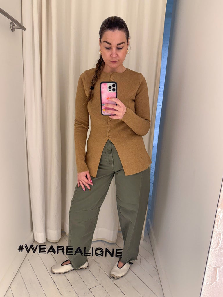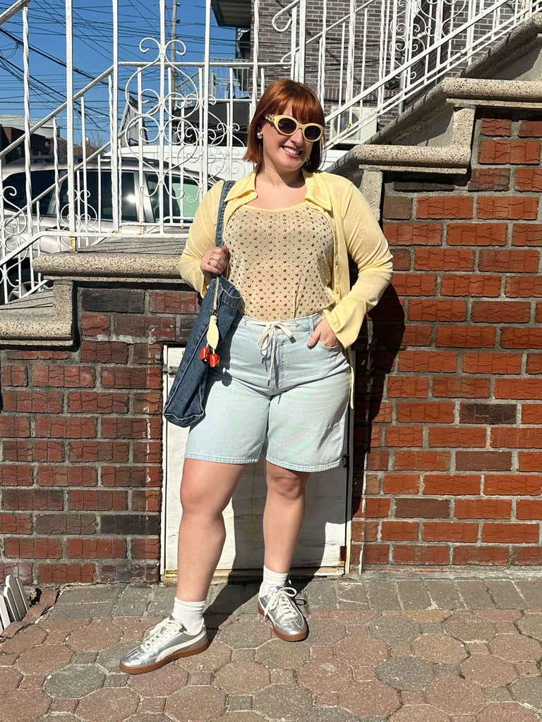 For one look, I styled a light-wash Pilcro pair (with a casual shoe lace tie) with sheer butter-yellow layers and matching Guess sunglasses. The unexpected color still pops — especially when paired with shiny metallic sneakers.
