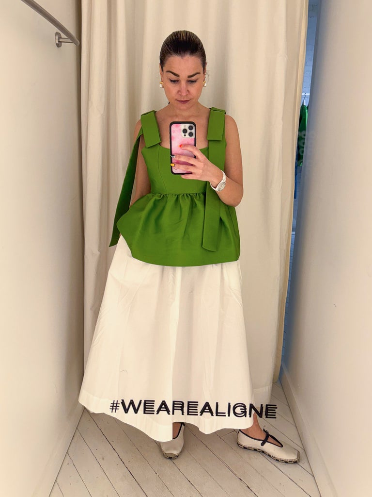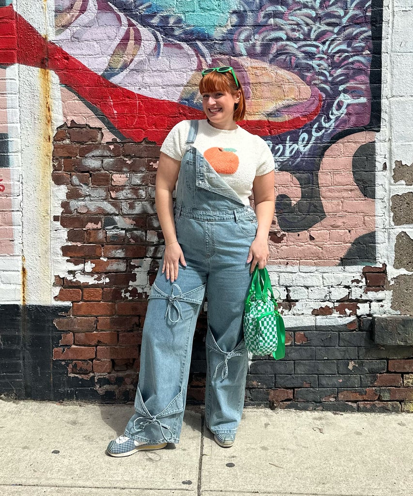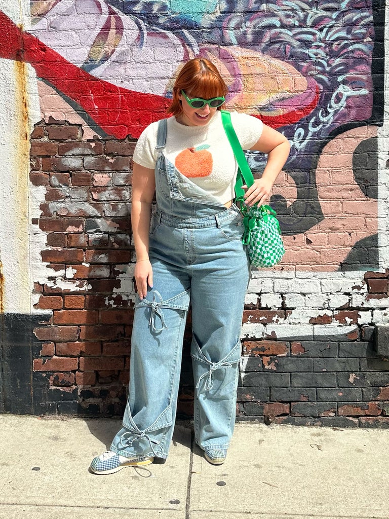 For a breezier vibe, I went with light-wash Cider overalls with bows tied down the legs. Paired with a gingham Calpak water bottle holder and Nike Cortez sneakers, the look felt playful and picnic-ready. If a slightly undone look speaks to you — especially for showing off a statement top — unhook a strap and try a mesh layer, graphic tee, or bikini top underneath.