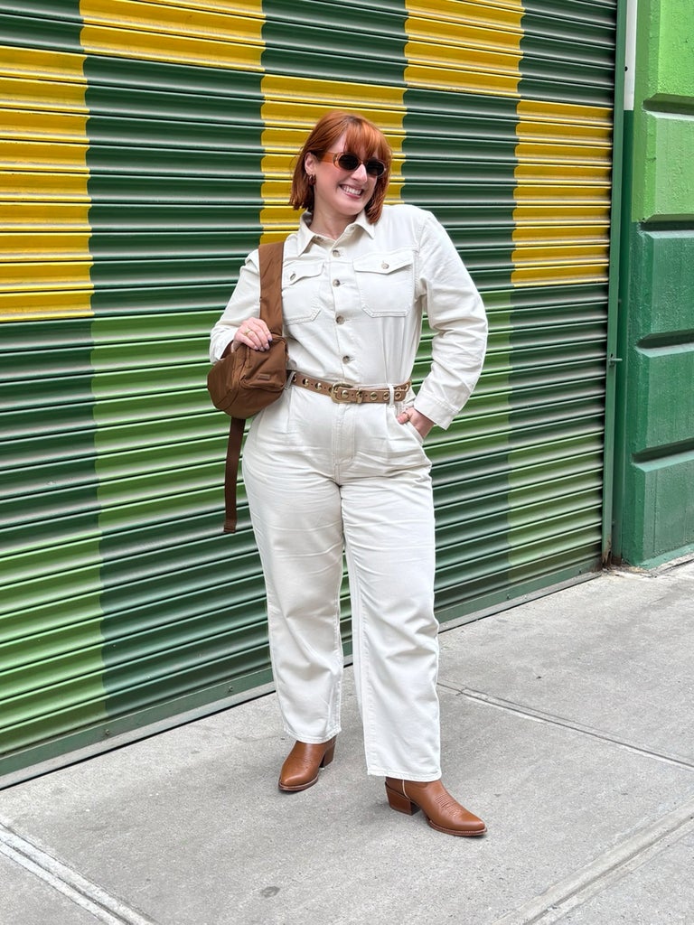 I styled a white barrel-leg jumpsuit from Madewell with a western twist: a studded belt, Tecovas cowboy booties, and an Away cargo pack. No matter your jumpsuit choice, adding tons of accessories is the key.