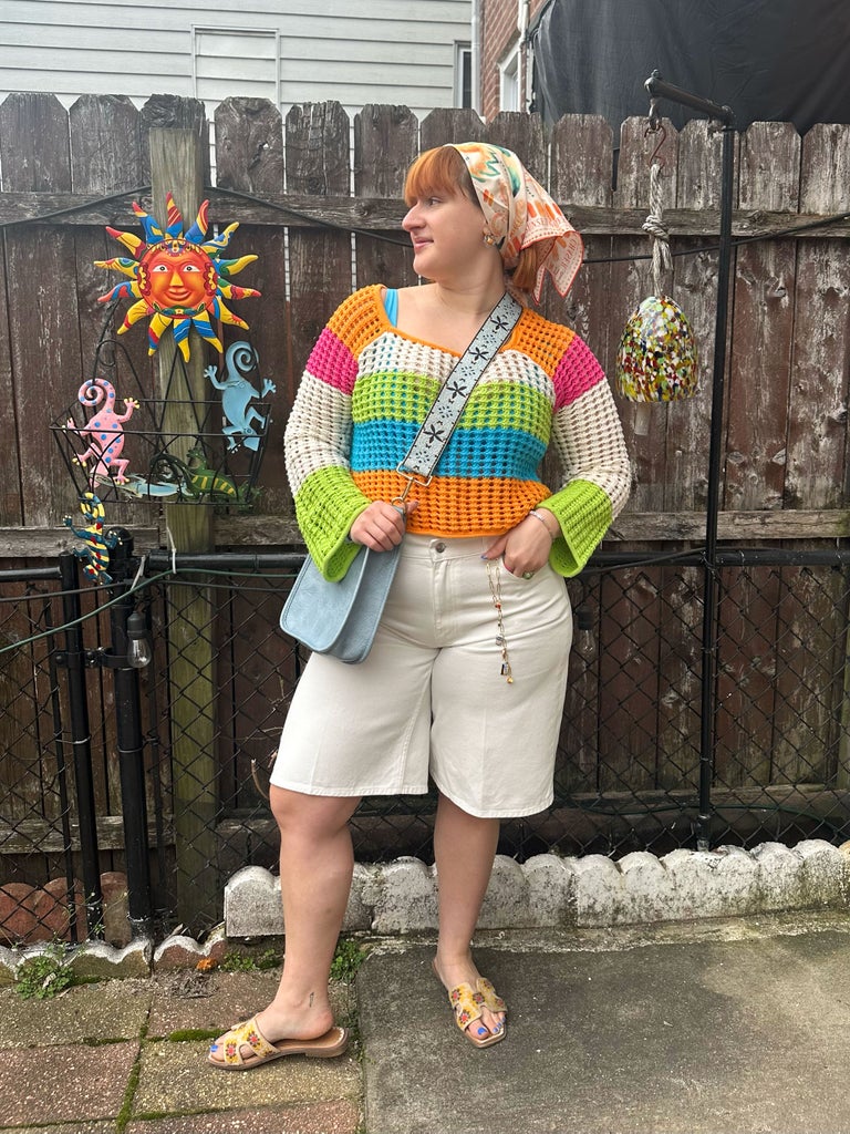 I also played with white H&M jorts, styling them with a rainbow crochet top, patterned crossbody bag, and a printed headscarf for a colorful, seaside-ready vibe. Add a belly chain or bag charm hooked onto the belt loops for a creative twist.