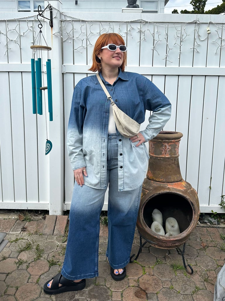 One standout set I wore was a gradient-dyed shirt and wide-leg jean combo from Kenneth Cole. I just buttoned the top at the neck to reveal a tank underneath, and slung on a Uniqlo mini bag. Platform slingbacks finished the look — the only sandals I trust on uneven festival ground.