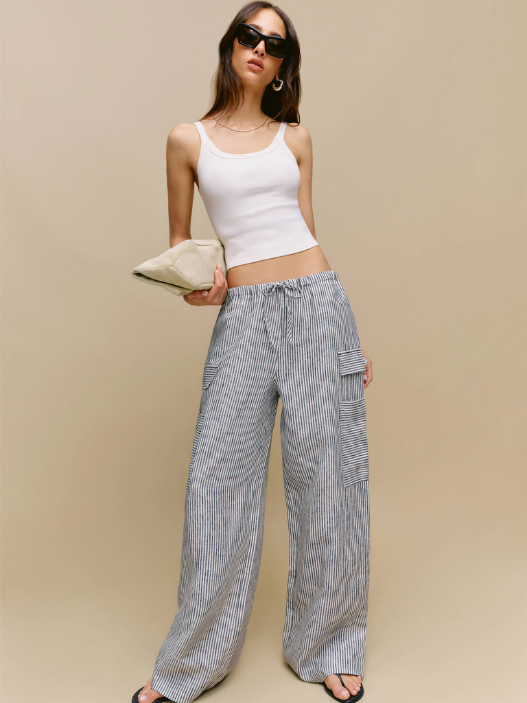 This season, the category is quietly thriving. You’ll find exaggerated barrel-leg silhouettes as the heat-proof answer to everyone’s favorite jean, cargo styles with a utilitarian feel, and striped pairs that tap directly into the sardine girl summer and fisherman trends. Meanwhile, wide-legs — from drawstring and low-slung to sharply pleated — are everywhere, anchoring everything from office looks to beach outfits with equal ease. Black linen makes the case for warm-weather minimalism, while crisp white remains a forever staple for those devoted to versatile neutrals.