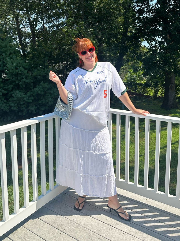 Inspired by the fashion girlies styling boxy jerseys with hyper-feminine staples, I decided to pair mine with a white maxi skirt and thong kitten heels — two summer wardrobe MVPs. Since this jersey is quite long and oversized, I draped and tucked it into the waistband, which gave the look a relaxed balance. Looking back, I’d add a chain belt to level it up even more for a night out.