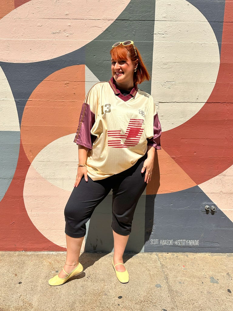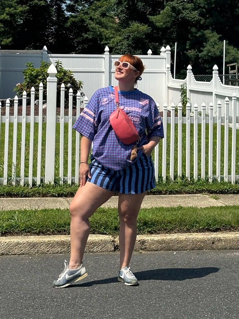 Sure, trendy jorts and baggy jeans are the go-to styling companions for soccer jerseys, but I wanted to channel the Adidas sprinter short vibe. For this look, I leaned into pattern and color: a checkered jersey, striped elastic-waistband shorts, and gingham Nike Cortez sneakers. A bright sling bag from T.J. Maxx and my beloved plush Monchhichi keychain brought it together, giving me all the joyful, comfy feels. It 100% made my inner child very happy — and officially cemented soccer jerseys as a new go-to for me.