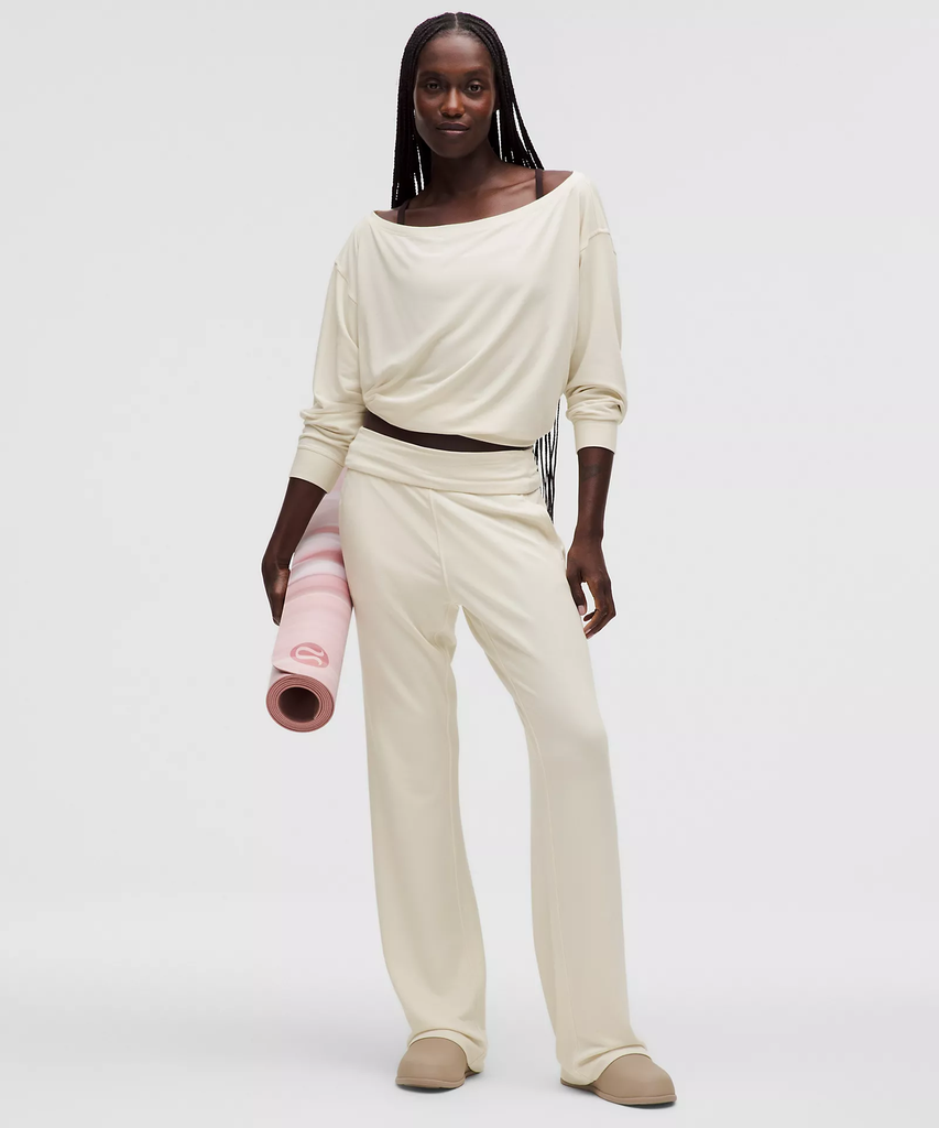 Super drapey and luxurious, the BeCalm Modal French terry fabric is available in new styles, like Bermuda shorts, meant to elevate your everyday activities. We think the boatneck long-sleeve top paired with the fold-over flared pants especially make for a chic yoga-to-brunch outfit. You also can’t go wrong with the oversized sweatpants that are flowy on the outside and fuzzy on the inside.