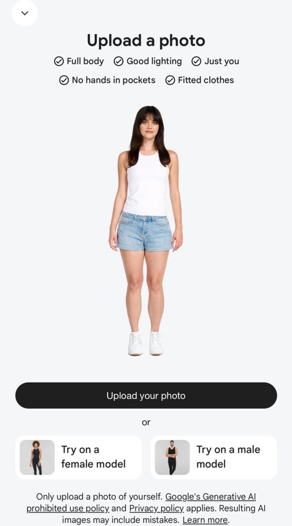 After uploading a couple of full-body photos of myself wearing fitting clothing as suggested on my phone, one photo worked best and saved into Google so it could be reused for every new product I selected. (I think in the future I’d opt for a tank top and biker shorts for the most accurate depiction of my body, especially for skin-baring pieces, but I was pleased with how Google auto-generated my body, especially in mini dresses (see below).