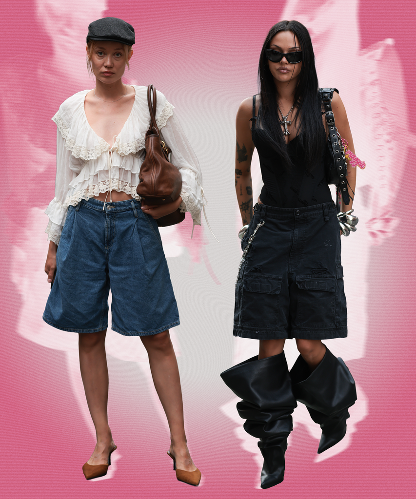Think of today’s most popular jorts — a portmanteau for jean shorts — as wide-leg denim… for warmer weather. This style, which usually fits loose and hits below the knee if not right above it, is a seasonal interpretation of this year’s theme of comfort and ease. Style these with a snug shirt for proportional balance, or wear them with an oversized graphic tee to go full Adam Sandler.